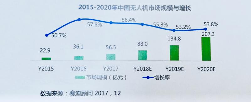 报告显示,2017年,中国无人机市场规模已经达到56.5亿元,同比增长56.4%。随着行业应用的不断拓展以及消费级市场渗透率的日益提高,未来几年无人机市场规模增长率将维持在50%以上。