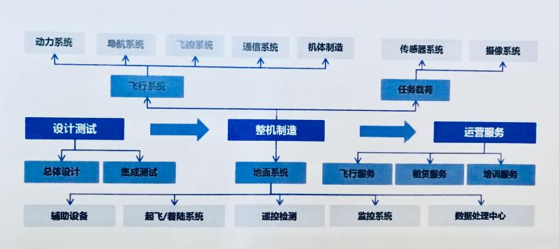 记者了解到,无人机主要包括设计测试、整机制造和运营服务三个环节。设计测试包括总体设计和集成测试两个方面;整机制造包括飞行系统、地面系统、任务载荷三个方面,是无人机制造的关键部分;运营服务则主要包括飞行服务、租赁服务、培训服务等。