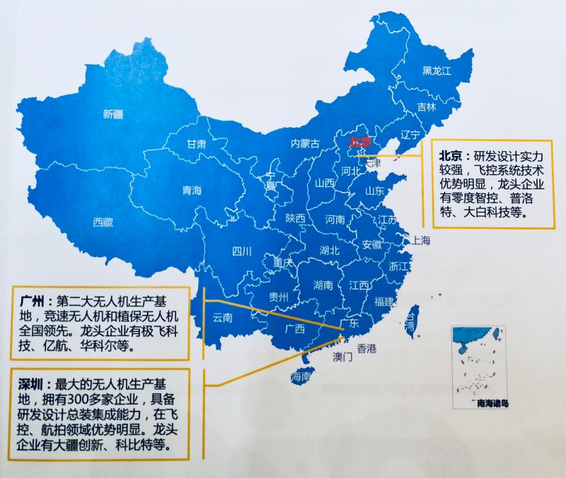 就国内产业格局而言,深圳和广州是民用无人机主要生产基地,总产值在全国占比超过90%,这主要得益于当地的区域配套能力和产业化能力;北京科研资源丰富,研发设计实力较强,飞控系统在全国占据领先优势。
