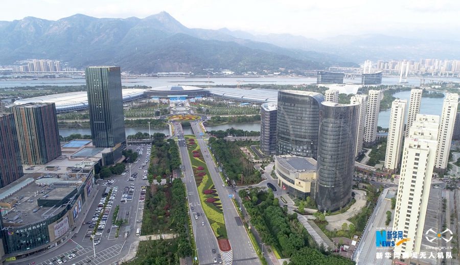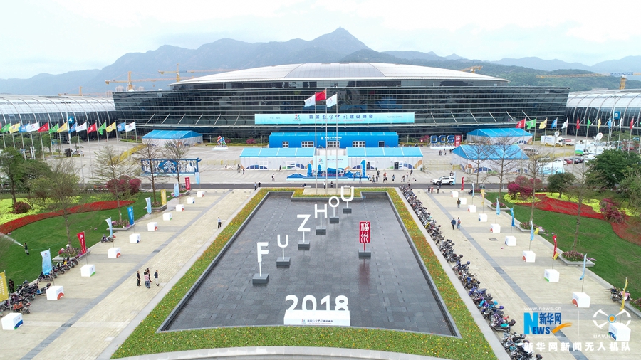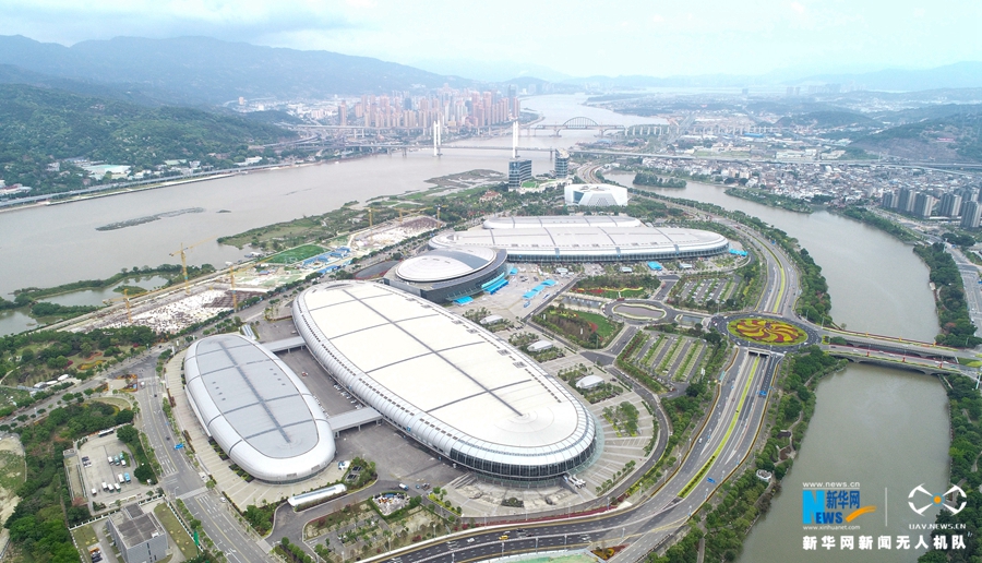 20日下午,装点一新的福州海峡国际会展中心,静待盛会如期举行(无人机拍摄)。新华网 肖和勇 摄
