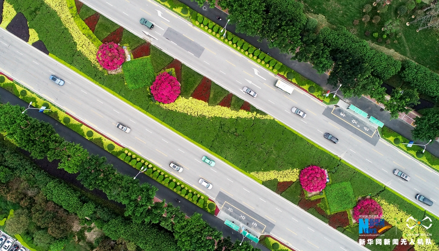 20日,通往福州海峡国际会展中心的潘墩路绿树葱郁,花团锦簇(无人机拍摄)。新华网 肖和勇 摄