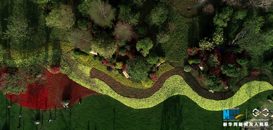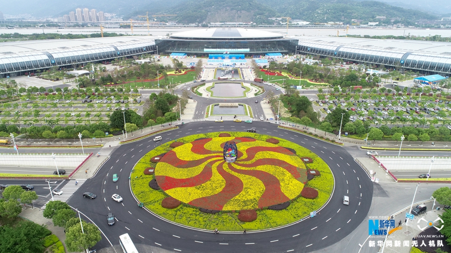20日,装点一新的福州海峡国际会展中心,繁花似锦,草木深深,绿草如茵(无人机拍摄)。新华网 肖和勇 摄