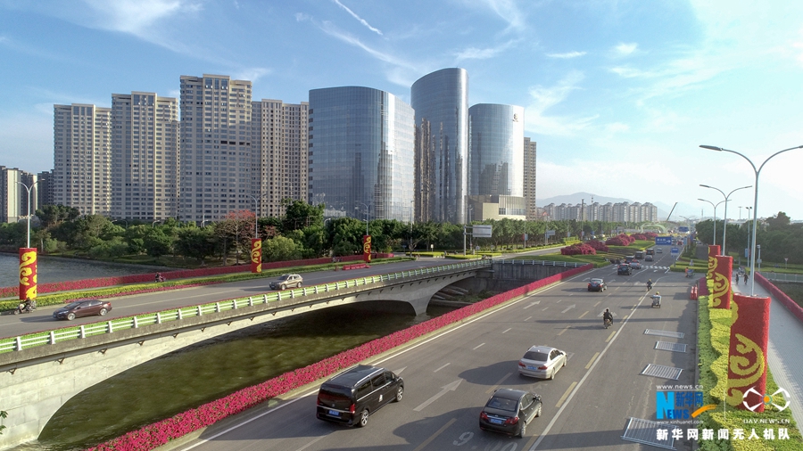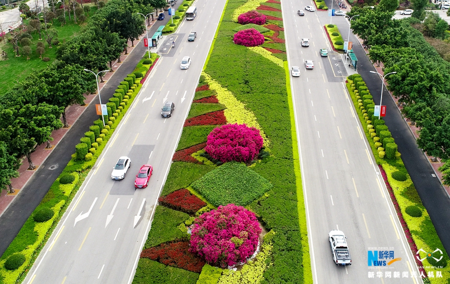 20日,通往海峡国际会展中心的潘墩路花团锦簇,绿树成荫(无人机拍摄)。新华网 肖和勇 摄