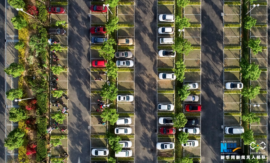 19日傍晚,夕阳中的福州海峡国际会展中心一处露天停车场(无人机拍摄)。新华网 肖和勇 摄