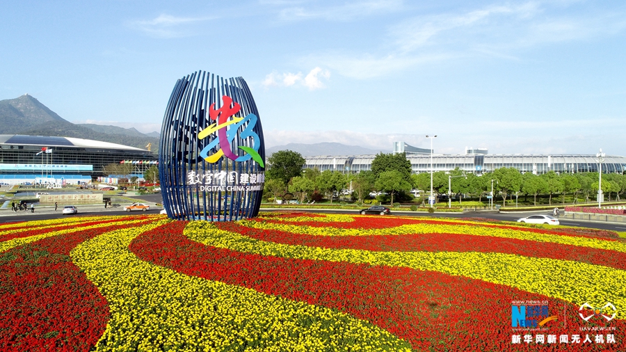 19日傍晚,福州海峡国际会展中心外的花坛在夕阳中显得格外美丽,中央簇拥着数字中国建设峰会标志(无人机拍摄)。新华网 涂天翔摄