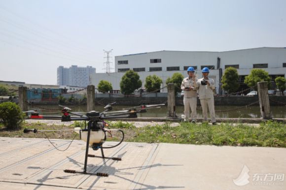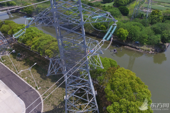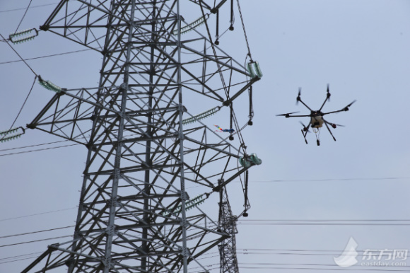 无人机前喷出了火,将缠绕在电线上的风筝线烧断,一只影响着输电线路运行安全的风筝,就此与输电线路脱开。这是记者在国网上海市电力公司检修公司“鹰眼”无人机小队的工作现场看到的画面。