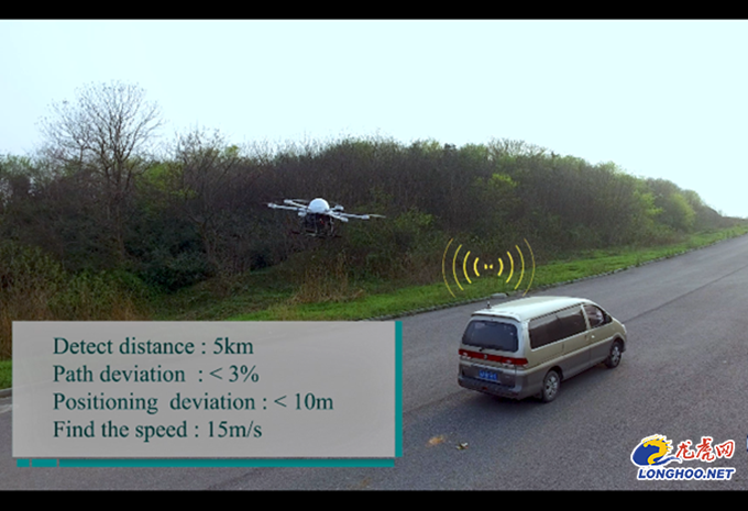 该项目中的唯一一名本科生,胡田钰同学生动地介绍道:“项目研发的非法电台侦测系统形象的说就是‘会飞’的频谱监测仪。”该无人机机身下方装载定向天线与摄像头,重达16公斤,可续航40至50分钟。吴启晖教授表示,该设备未来有望更加轻便化。从该团队的演示视频中可以看到,一架飞行的六旋翼无人机通过搜索后发现,一辆移动的面包车正在发送黑广播,无人机快速定位,并对移动的车辆进行持续跟飞。