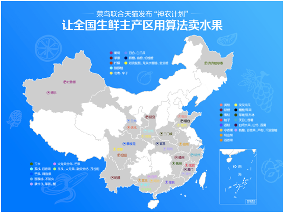 4月26日在陕西省武功县,来自全国各地的100位县长观摩了黑科技下田间。菜鸟与天猫当天联合宣布启动“神农计划”,将在全国开设100个原产地生鲜仓库,覆盖全国生鲜主产区,将工业级标准引入生鲜供应链全领域,用算法和黑科技帮助农户卖水果、运水果。