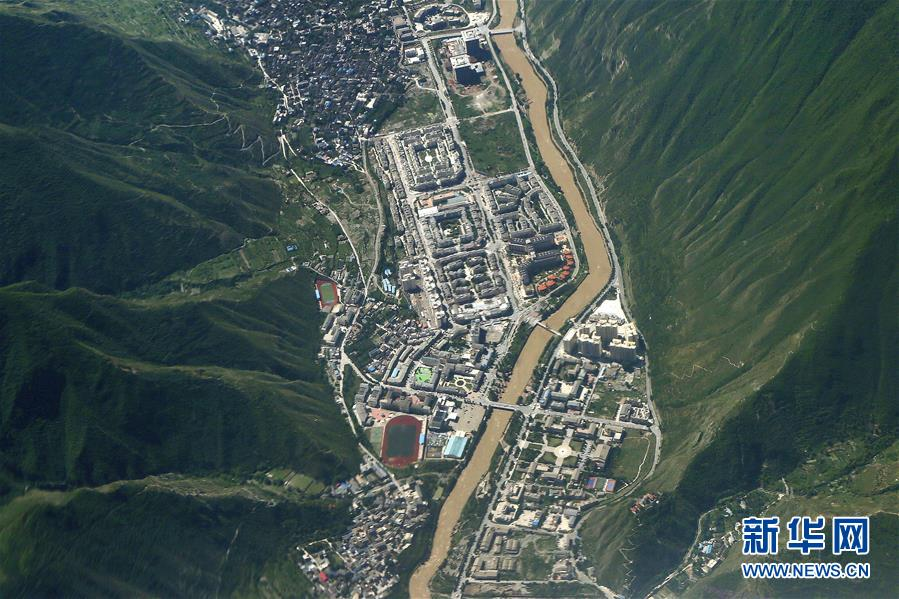 空中拍摄的震后九寨沟县城