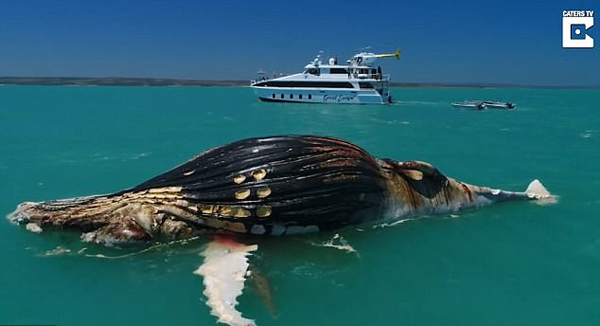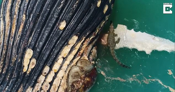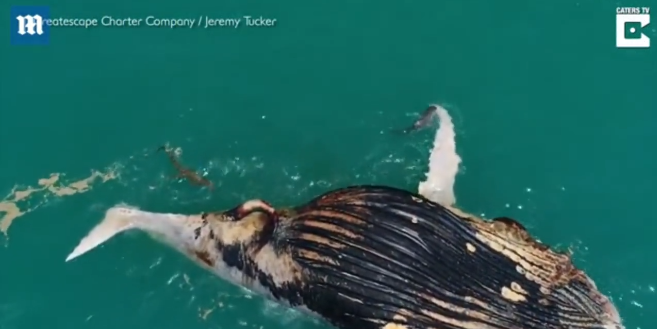 杰里米一行人看到这一罕见景象后,决定进一步观察了解。于是他用无人机记录虎鲨和咸水鳄共食画面,由于座头鲸体型巨大,成群的鲨鱼和鳄鱼都在共享这一盛宴。他们不停的吃食座头鲸的鳍、尾巴和身体,根本没有时间注意其竞争者的吃食。当杰里米返程时,座头鲸已漂浮到蒙哥马利礁,“进食者”们依然在继续享受盛宴。