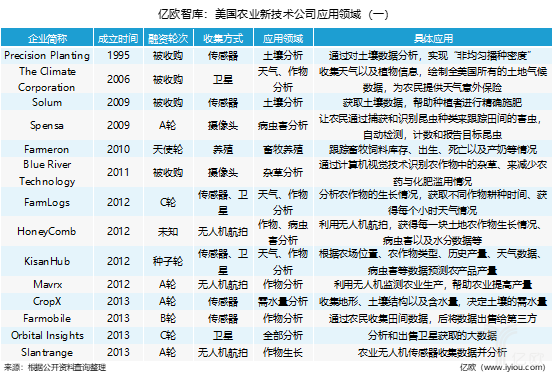 2006年成立的The Climate Corporation公司,利用卫星进行天气数据的收集并对数据进行分析,为农民提供意外保险服务。2014年成立的HydroBio公司同样利用卫星进行气候和土壤数据的收集,为农民提供灌溉建议。通过专注的数据收集方式,应用于专注的细分领域,但大部分公司最终目的都是能够预测农作物的产量。