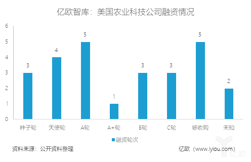 图中展示了所找到的26家企业中的融资情况,其中B轮、C轮和被收购的公司总共11家,占比超过42%。在被收购的五家公司中,有三家是成立于2010年以前的。美国农业科技行业发展较中国靠前,中国目前还没有出现农业科技企业被收购的案例。