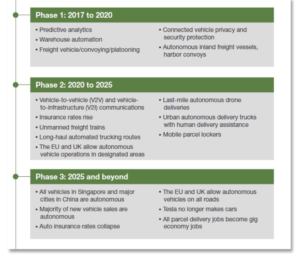 Forrester 表示,「在我们看到自动驾驶汽车真正为广大的消费者所接纳之前,像亚马逊、DHL 和 UPS 这样的物流运输公司将开创自动驾驶汽车的商业化应用。实际上,每次采访中我们都在这样一个观点上达成一致:运输物流是汽车自主性最能在近期展示出其潜力的一个领域。」