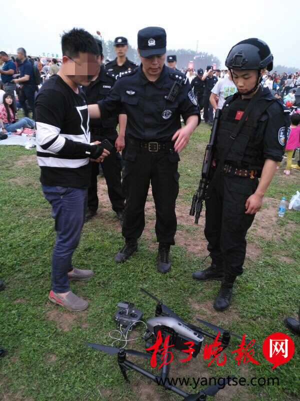 警方介绍,29日下午5时许,一架未经许可的大型无人机,出现在镇江世业洲长江国际音乐节演长江舞台前方50米处。当时正在进行现场巡逻的满芳芳、王年祥、孙翔炜等三名特警队员发现后,立即通报镇江警方巡特警无人机,随即予以追踪并发出警示。但这架无人机对警方无人机“熟视无睹”,反而更加“肆无忌惮”,做出多个具有危险性的飞行动,让巡逻的三名特警队员都捏了把汗。