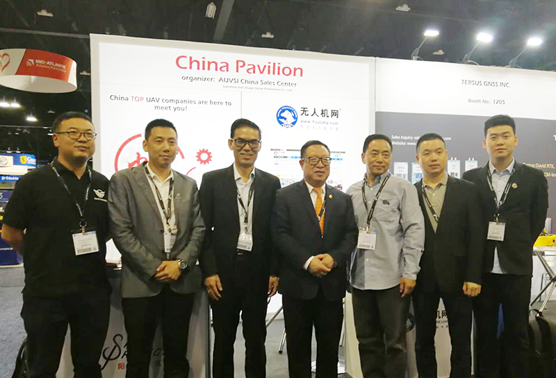 展会第一天,无人机网的展位上便到来了三位重量级人物,深圳市无人机行业协会会长杨金才先生(中)、AUVSI中国销售中心总经理朱炜先生(左三)、珠海市无人机协会执行会长谢峰先生(右二)相约莅临无人机网展位,我网CEO胡扬波陪同。