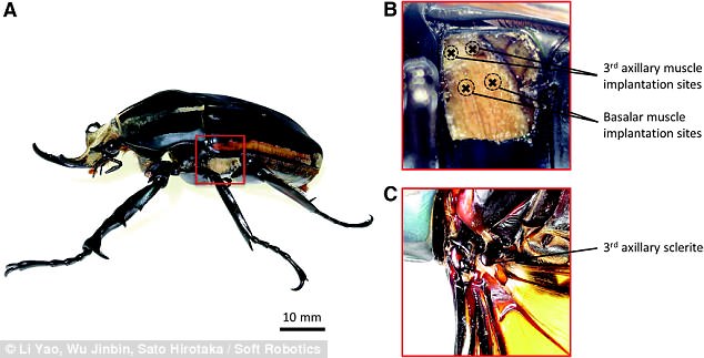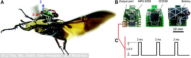据英国《每日邮报》5月3日报道,来自新加坡和马来西亚南洋理工学院的研究人员将人工设备和巨型甲壳虫结合发明出机械甲壳虫。机械甲壳虫的具体原理是,科学家将无线电发射机用线固定于甲壳虫背上,把电极植入其四处飞行的肌肉,并利用电子脉冲控制它们的飞行方向,通过改变脉冲频率使其加速飞行。