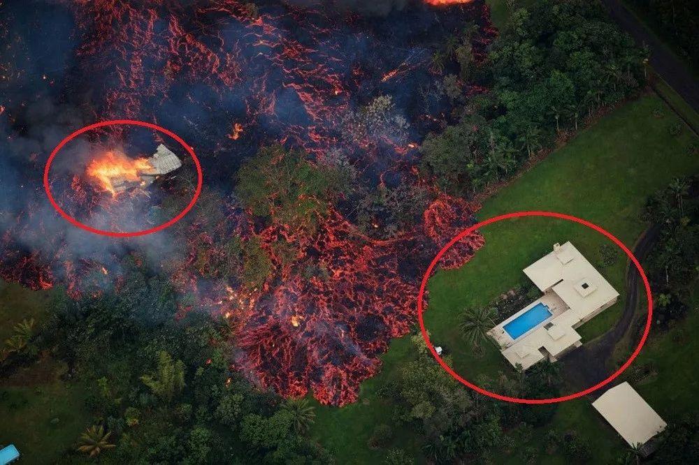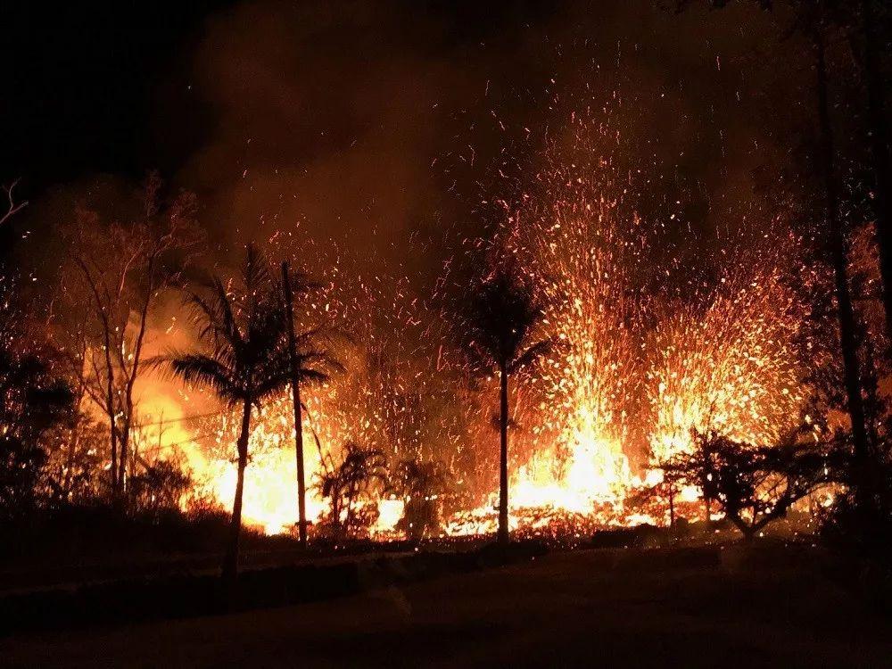无人机航拍到不可思议图片,图片显示在郁郁葱葱的森林中露出一片可怕的红黑色,火红熔岩正在飞溅。一栋燃烧着的别墅正被红黑色熔岩所包围,熔岩正步步紧逼另一套带有泳池的别墅,距离不到20米。夏威夷县民防局称其为 “活跃的火山喷泉”。而一些居民却坚持称:这是夏威夷火山女神派利来开垦她的土地。