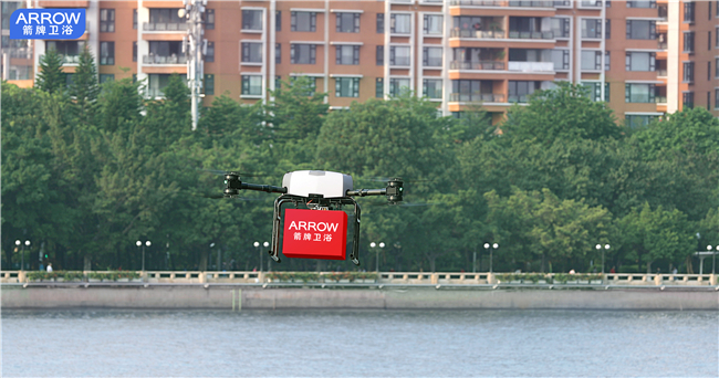 箭牌卫浴联合京东无人机广州首飞!飞过广州塔,跨越猎德大桥只为与您相见,箭牌卫浴联合京东物流仓配一体服务,开启购物新体验,卫浴黑科技,一箭送到家!
