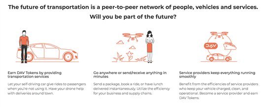 从预订出租车到订购包裹,甚至是购买在线食品——DAV正将上述方面自动化。通过利用以太坊驱动的区块链技术和智能合约,DAV旨在实现用户间的点对点经济。通过使用DAV代币,消费者和服务者都能在一个安全、透明的系统内进行服务的提供和消费。