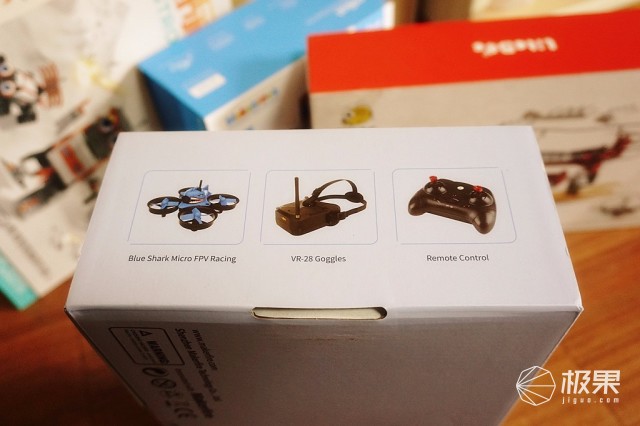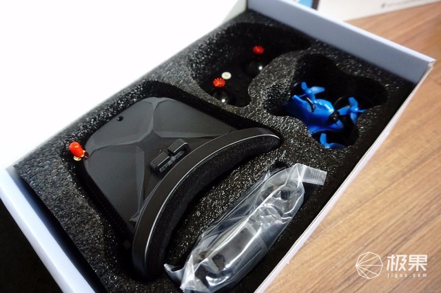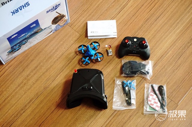 在包装的侧面就可以看到这套无人机的配置,一台无人机,一个FPV眼镜和一个遥控器。打开盒子后就可以看到这三个部件,不过比起普通的无人机,Shark穿越机遥控器和无人机部分会小很多。