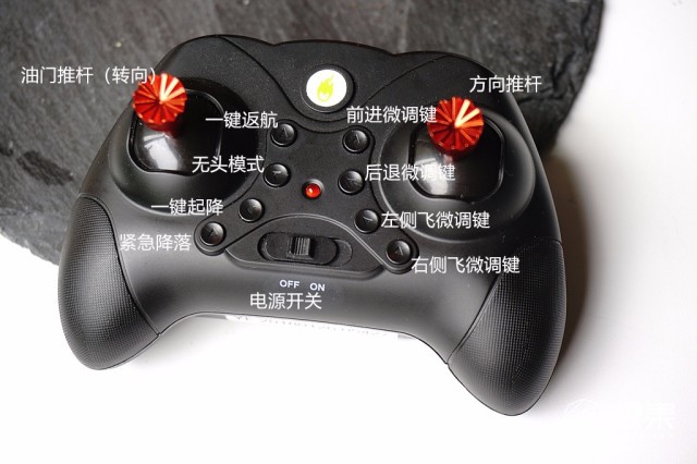 遥控器的控制模式,如果按照专业无人机的遥控对比,Shark穿越机应该属于“美国手”,就是左摇杆负责上身/下降和机头左右旋转,右摇杆负责前后左右移动。而且还在遥控器中加入了一键返航、一键起降和无头模式,对于初学者来说,是非常的重要,也极大的提升了无人机的操控性。另外,类似游戏手柄,除了大拇指操控,前面左右两个还可以通过食指调速和翻滚。