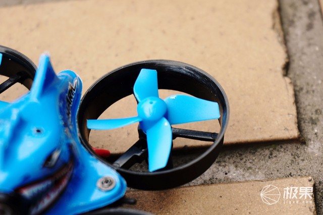 Shark穿越机个头是真的小,放在掌心对比,还没一个手掌大。机身尺寸,83.5*83.5*45.6MM,中间是一个鲨鱼造型外壳,带有FPV系统,广角摄像头,四周30mm螺旋桨,图传天线等等。应该说是见过的无人机里最小的一款,也是MINI无人机里配置最齐的一款了。