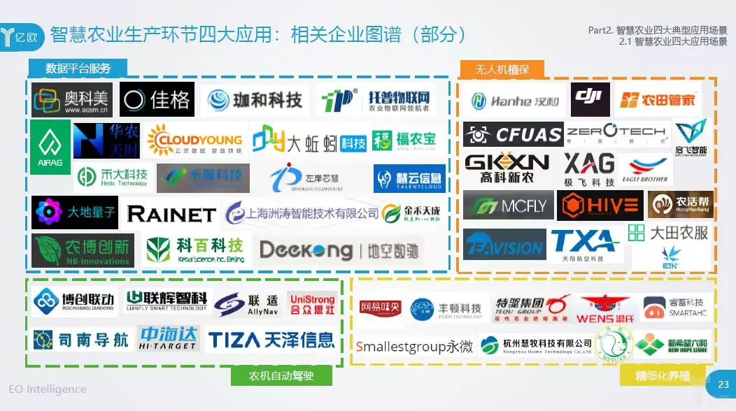 广义的农业分为农、林、牧、渔以及副业,新技术主要体现在农业的生产环节。当前,着重应用于农业种植和畜牧养殖两个方向上。智慧农业生产环节的四大典型应用包括数据平台服务、无人机植保、农机自动驾驶以及精细化养殖,根据四大应用场景,列举了部分企业的应用图谱。