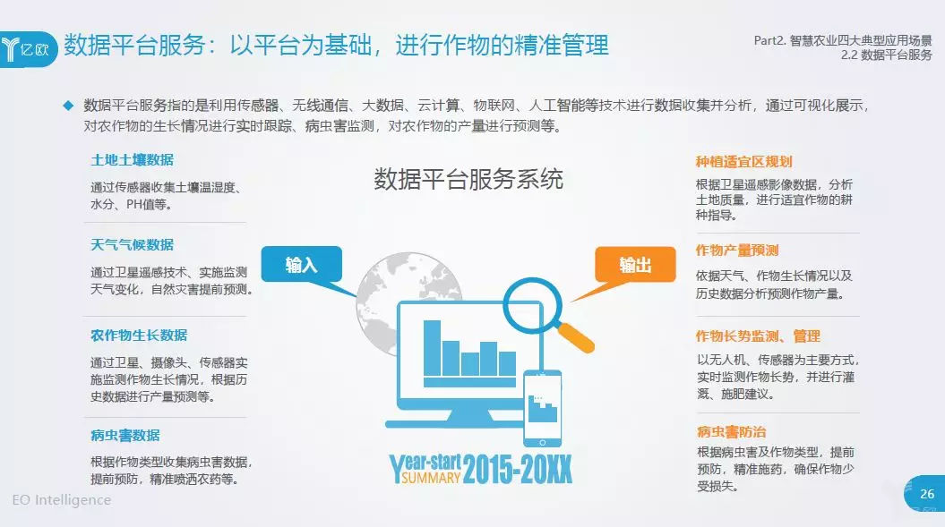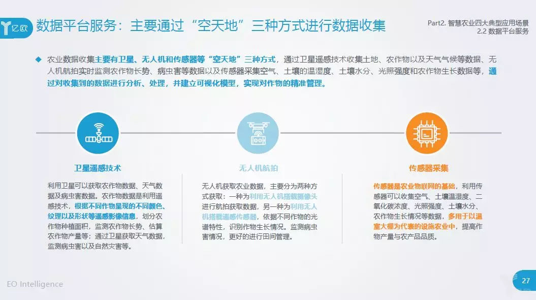 报告详细探讨了数据平台服务的定义、应用方式以及当前行业发展存在的问题,另外三个应用无人机植保、农机自动驾驶和精细化养殖,请查看完整报告。