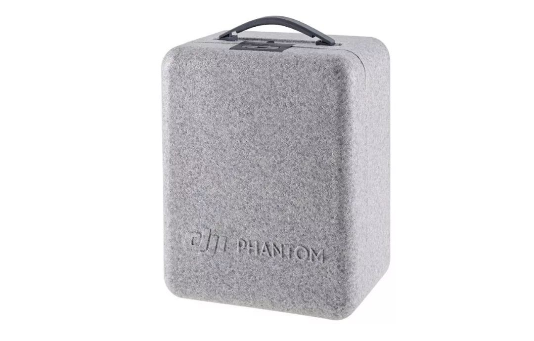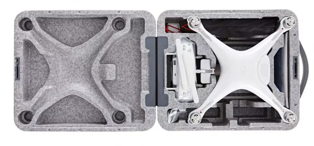 在2016年发布的大疆精灵Phantom 4有了一个自带的EPP箱子,EPP箱为无人机提供防潮、抗震的日常保护。在使用的时候,在沙石路或者磁场干扰严重的地方,还为无人机提供了一个停机坪。晒纹的方式处理表面,让EPP有了精致的观感,也很匹配产品的调性。