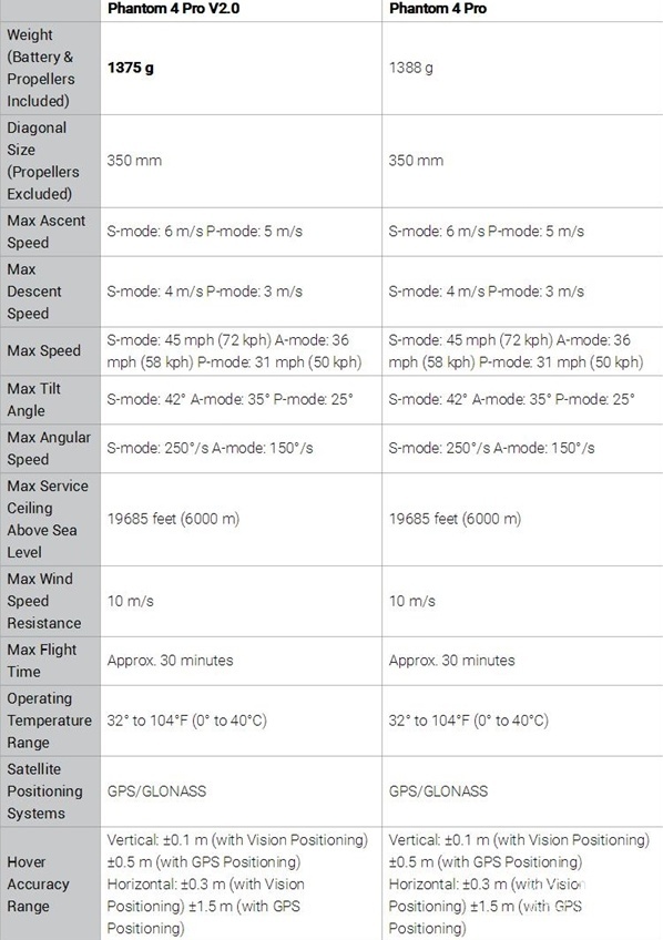 大疆精灵4 Pro V2.0 重 1375g,拍摄方面仍然采用拥有 1 英寸的 CMOS、2000 万像素的传感器和接近 12 档动态范围。它采用新一代 OcuSync 高清图传,支持双频通讯,能无线连接 DJI 飞行眼镜。新一代无人机引入了全新的静音动力系统,采用新的桨叶和电机,整体噪音比前代降低了约 60%,续航时间仍为 30 分钟。由于采用了全新的图传系统,Phantom 4 Pro V2.0 的遥控器不与其他产品通用,其配有普通遥控器及一体式遥控器两款遥控器,其中一体式遥控器配备有一块 5.5 英寸 1080P 高亮度显示屏。