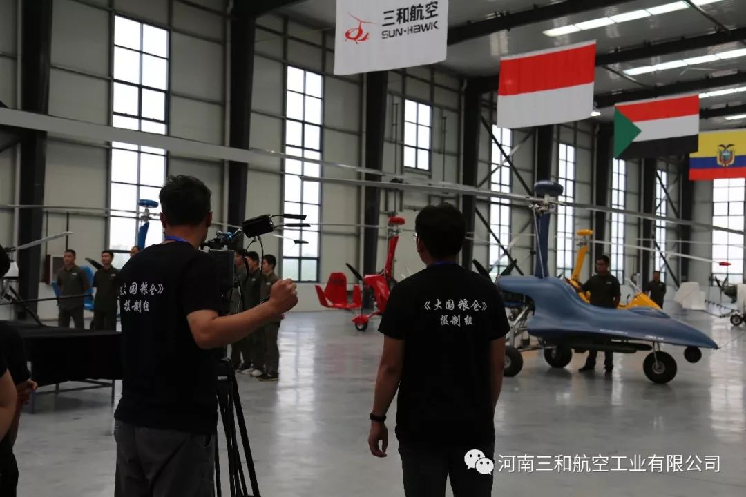 河南三和航空工业有限公司作为专业从事工业级大载荷长航时无人飞行器和载人自转旋翼机设计、研发、制造、销售的专业公司,今天迎来了中央电视台拍摄大型系列纪录片《大国粮仓》摄制组,主要拍摄了我公司自主研发的两款可应用于农林植保行业的产品——“太阳之鹰”自转旋翼机和“小旋风”无人机,并在我公司技术人员的协助下共同完成了记录片的拍摄。