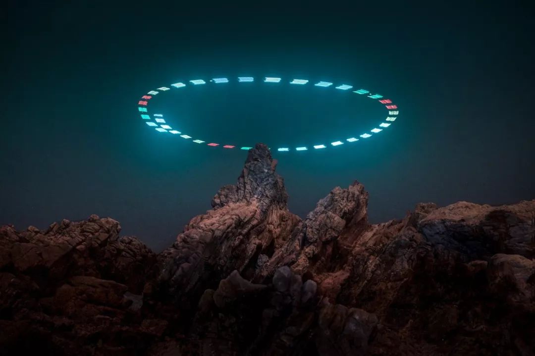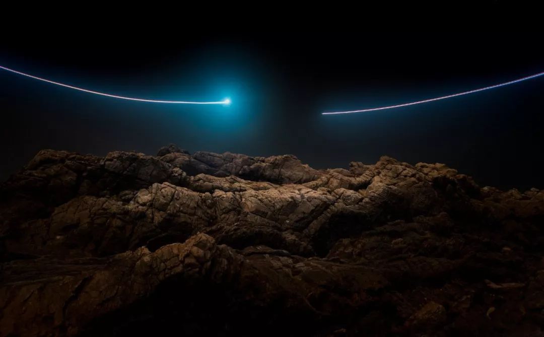 纯拍摄无人机光绘线条相对单调,在画面中加上自然风光、地标建筑等元素,可以让作品在视觉上更有吸引力,英国摄影师Reuben Wu曾拍过一组无人机光绘相关的摄影项目:LUX NOCTIS,大部分拍摄场景选择在美国西部岩石山体,作品中既有无人机的运动轨迹,也有山体被打亮的痕迹。