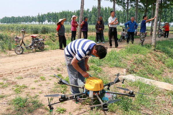 在曲阜市王庄镇绿郁郁的麦田里,伴随着一阵马达轰鸣声,装载着农药的“植保无人机”在技术人员无线装置遥控下,在麦田低空飞行,实施小麦“一喷三防”统防作业,吸引了众多群众驻足观看。