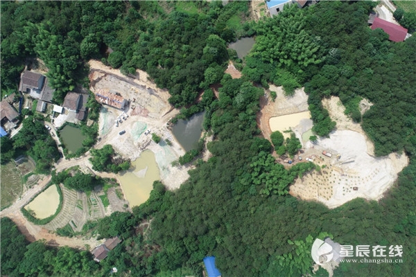 5月14日,在长沙县青山铺镇,长沙县行政执法局联合青山铺镇政府、县森林公安局等50余人,依法拆除广福村一非法占山采砂点。行动现场,执法人员通过无人机进行巡航传回的画面看到:被开挖的山体“遍体鳞伤”,绿色的峰峦被撕开口子,裸露的山体表面“沟壑纵横”;道路泥尘飞扬,村中树木沾满粉末;附近的水塘因混入泥砂,变得浑浊不堪。