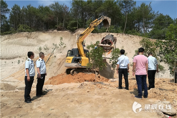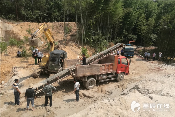 (长沙县行政执法局立即调来吊车、货车等设备,及专业工人,对该处非法占山采砂、洗砂点的设备依予以拆除。)