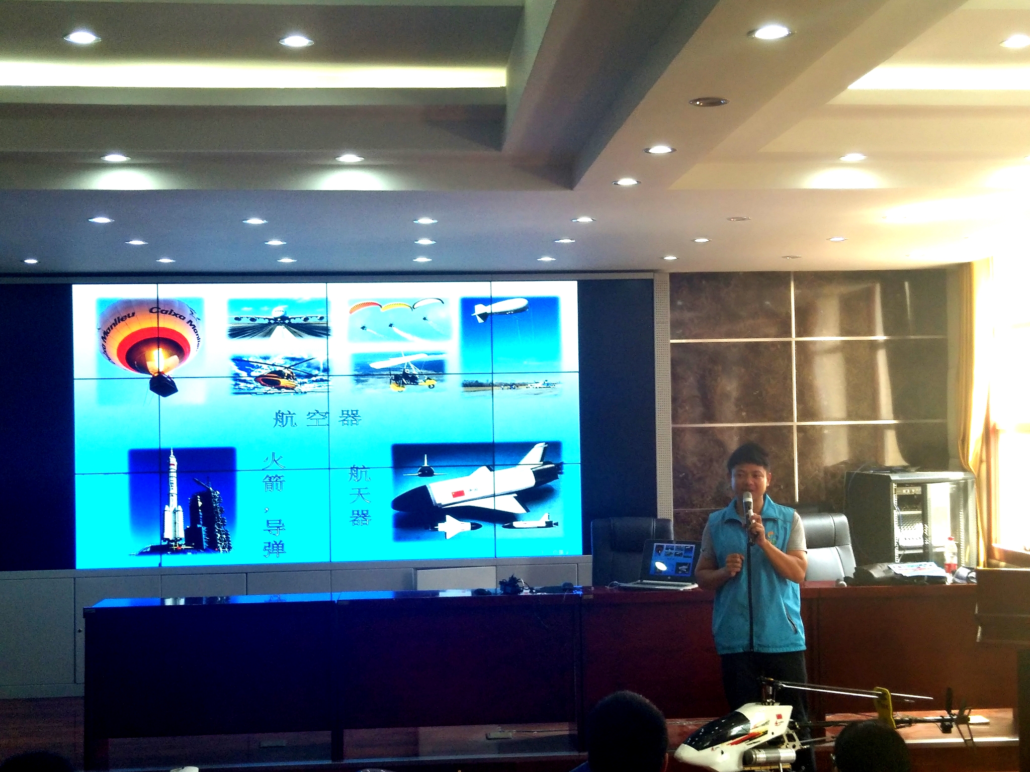 首先,来自武汉爱飞客航空科普营地的胡老师从飞机的诞生讲起,介绍了飞机发明创造的历史、飞机飞行原理、直升机与无人机的诞生和历史发展、现代无人机应用的知识。胡老师的讲座生动而又有吸引力,中间穿插了许多视频、图片以及实物展示,通过互动问答让讲解更加直观、有趣。讲座激发了学生对航空飞机研究和操作的兴趣,让学生对无人机有了初步的了解,激起了现场每一位同学们的兴趣和好奇心。