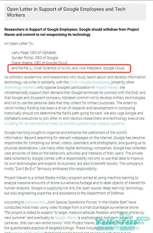 有媒体注意到,在收到公开信的四位高管中,许多人心目中的AI女神李飞飞的大名赫然在列。难道Google此次为美国军方工作的项目中,李飞飞将在其中起到莫大作用?据之前消息透露,在五角大楼Maven项目中,谷歌云部门参与了Maven计划,而李飞飞正是该部门首席科学家兼副总裁。