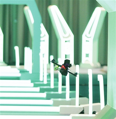上午9:50,大赛总裁判长林戈发出指令:“无人机竞速赛第一轮第一组比赛现在开始。”伴随着场内倒计时,比赛信号灯由红变绿,只见4架无人机从4个起飞台一跃而出,在律动的节奏中扎进赛道,疾驰、转弯、攀升……上演着刺激感官的空中特技。