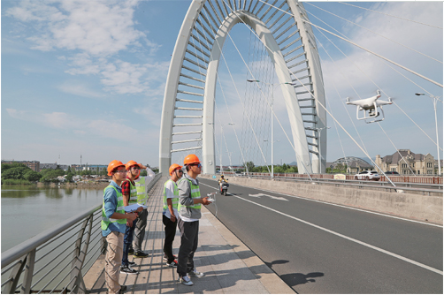 为城区荆邑大桥进行“体检”,进一步提高桥梁检测维护效率。图为5月16日,技术人员正在操控无人机对桥梁进行检测。