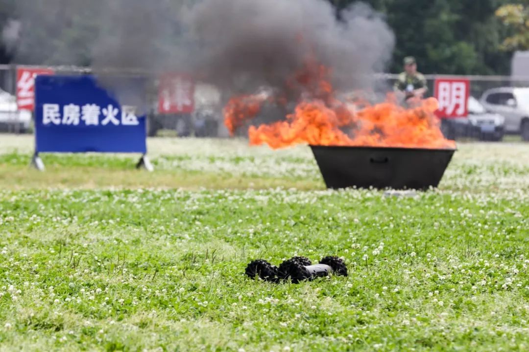 投掷的3枚灭火弹在火堆中5秒后爆炸,扑灭着火点。