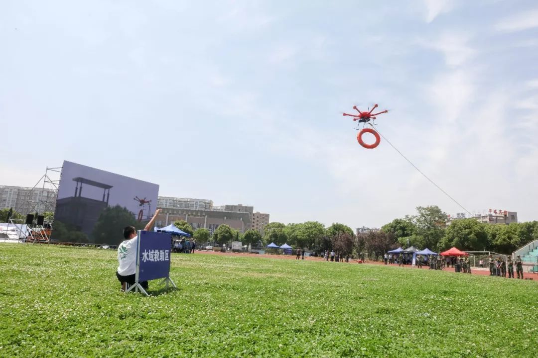 无人机携带高清云台相机和抛投模块,携带救生圈投掷被困人员。