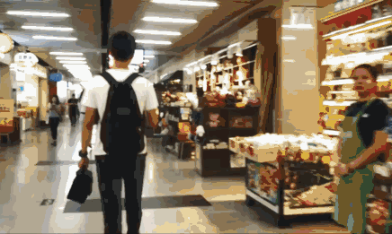 手持无人机拍摄一段穿过商场和地铁的追随镜头