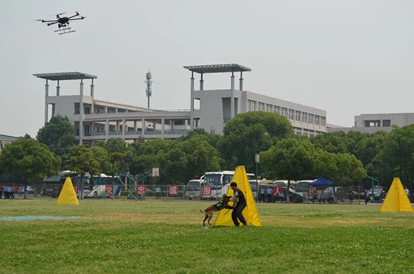 澎湃新闻从浙江省公安厅了解到,此次演练中,衢州市公安局所报的《警用无人机与警犬协同作战》演练科目,利用警犬在搜捕中的追踪与控制优势,结合无人机的空中观察与越障优势,通过对警犬进行条件反射训练,完成了让警犬自主跟随无人机越过危险区域和复杂地形,准确抓捕嫌疑人的战术动作。该科目通过一系列战术配合,将解决抓捕任务中因环境危险、地形复杂导致人员受伤或嫌疑人逃脱的难题。