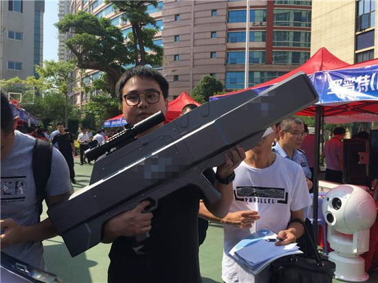 而针对一些违规操作的无人机,现场展示的一款低空无人机快速防御设备则是它们的克星。据研发企业工作人员表示,这款产品是针对一些低空小型无人机“黑飞”、“乱飞”而设计的,只要将这款防御设备对准要击发的目标,持续按动按钮,就可以中断无人机与操作者之间的联系,迫使无人机降落或者原路返回。这款设备的有效射程在500米,持有者仅需在5-45度范围内瞄准即可。