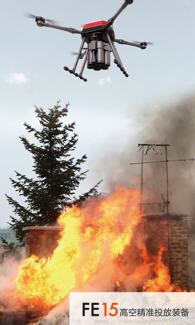 除了搭载火箭发射器用于高空灭火外,FE15也能搭载垂直发射器。垂直投掷灭火弹,特别适合于森林灭火。平时对森林进行大范围的防火侦查,当发现森林某处有着火点或初燃烟雾时,无人机到达上空垂直投掷灭火弹,进行森林灭火。