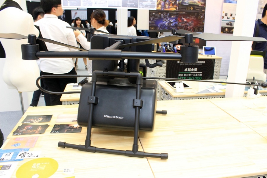 大叶大学工业设计学系展出一款清洗电塔作品《 Tower Cleaner 》,设计者胡瑞芫同学表示,传统清洗电塔有人力和直升机两种,前者具危险性,后者成本高昂,所以想到以无人机来进行清洗,风险较低而且成本比起用直升机便宜得多。无人机可载最多 10 公升水,最大负重为 10 公斤,机身前方具有镜头可以图传影像方便操作,同时也有避障和环绕等功能。