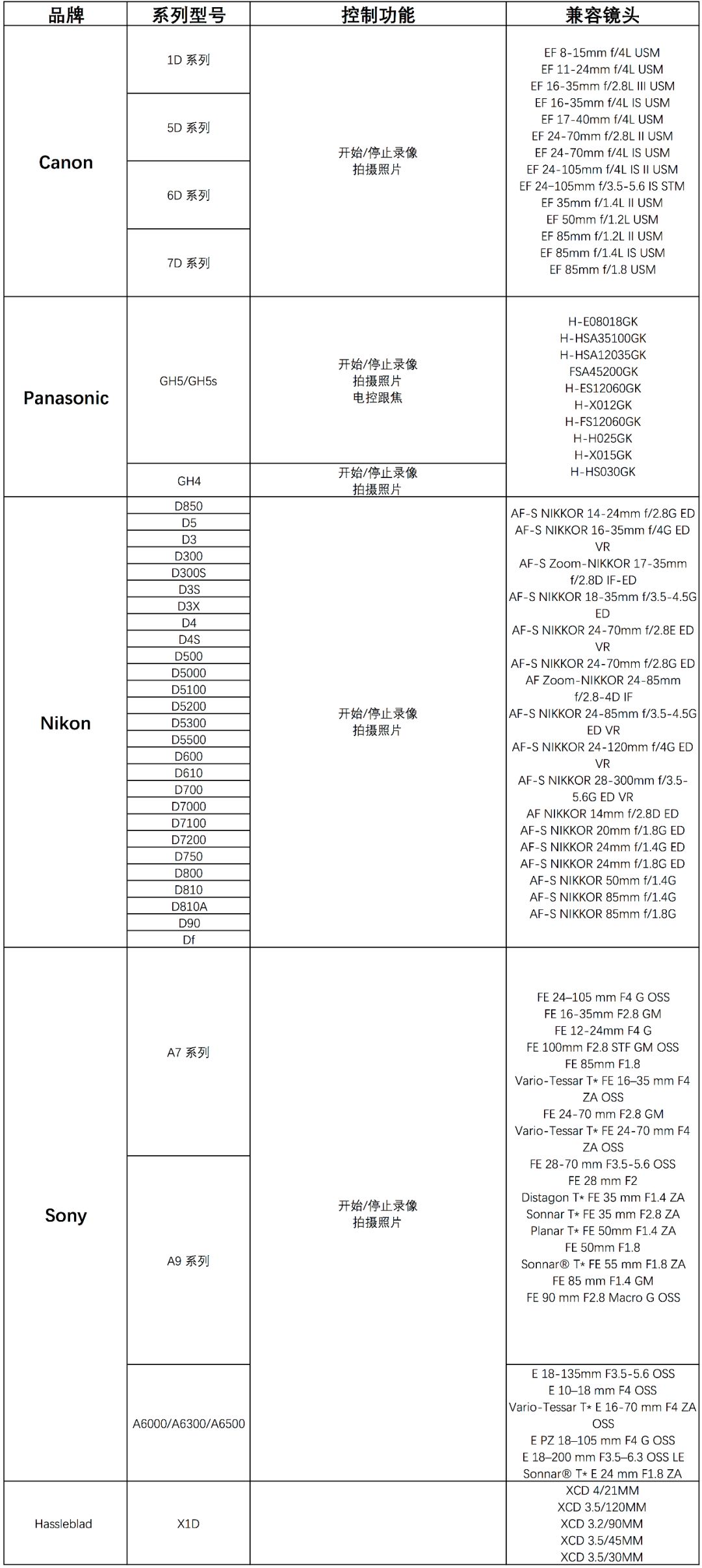 如影 S 兼容市面上主流的相机及镜头组合,通过 app 还可以实现 ISO、快门等相机功能调节[3],提高拍摄效率。目前,如影 S支持的相机型号及镜头组合列表如下: