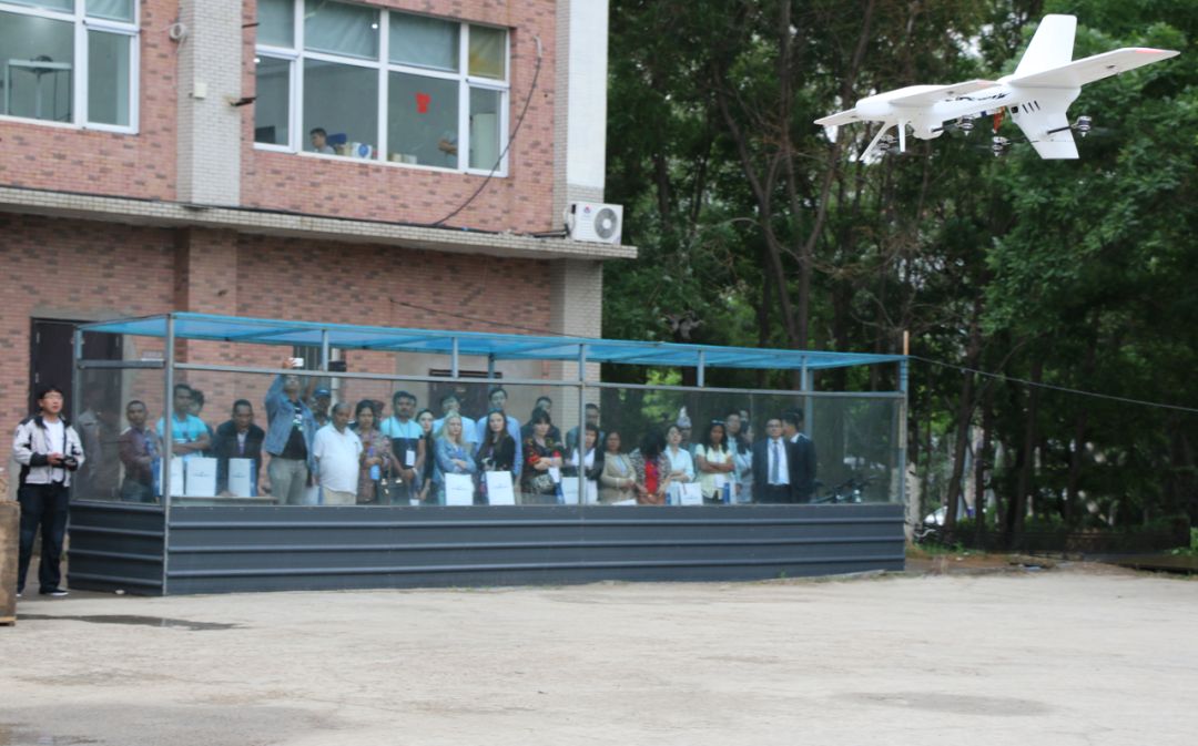 尽管当天的天气下着雨并伴有4-5级的西南风,但丝毫不影响无人机飞行。研修班学员一行前往飞行试验场地观看了矢量多旋翼无人机、串列翼倾转旋翼无人机飞行演示,现场演示了垂直起降、百公里加速、满速急停、倾转飞行、悬停等一系列飞行动作,精彩的飞行演示,赢得研修班学员的阵阵赞叹和掌声。