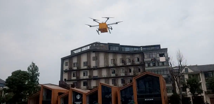 在杭州未来科技城,仓前老街附近一架无人机腾空而起,几分钟后,一杯热腾腾的咖啡就送到了某幢办公楼前。