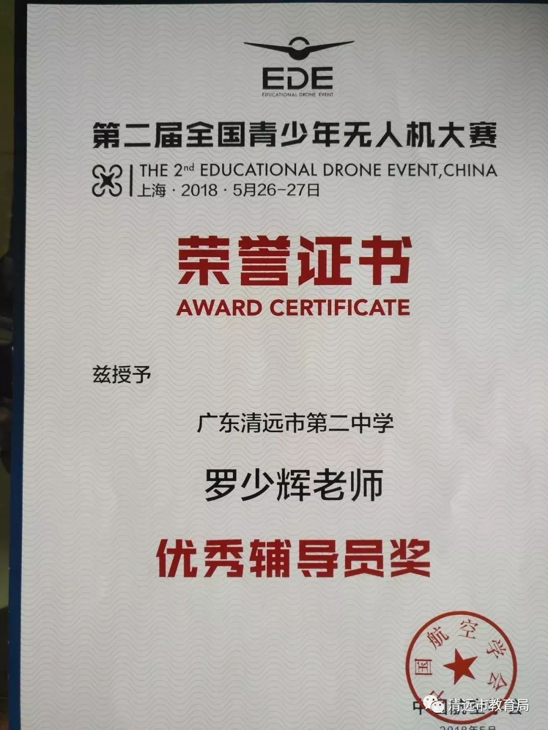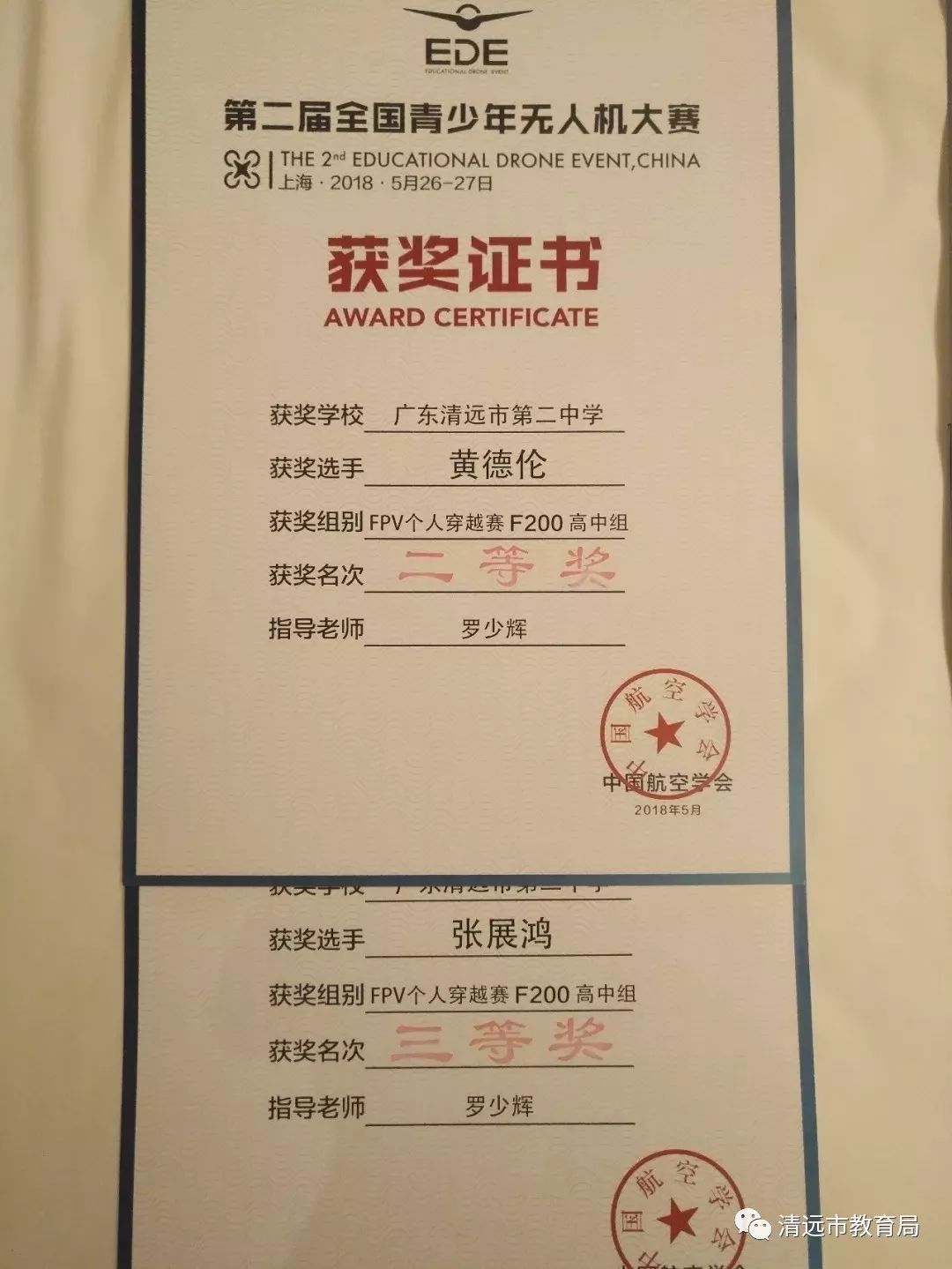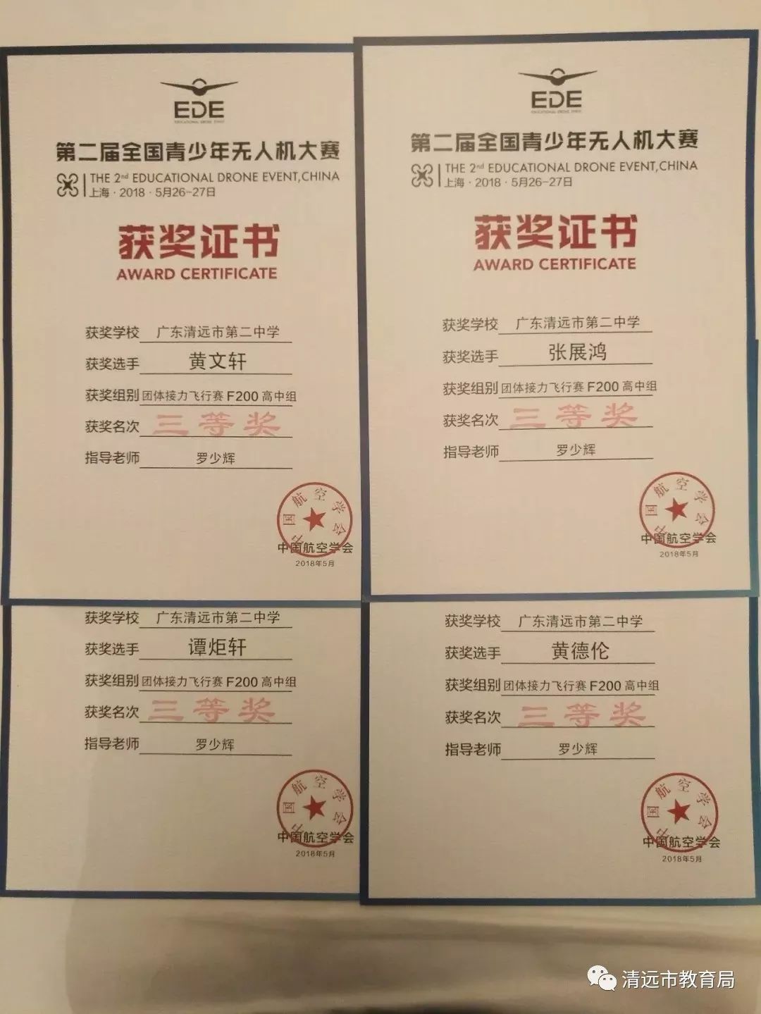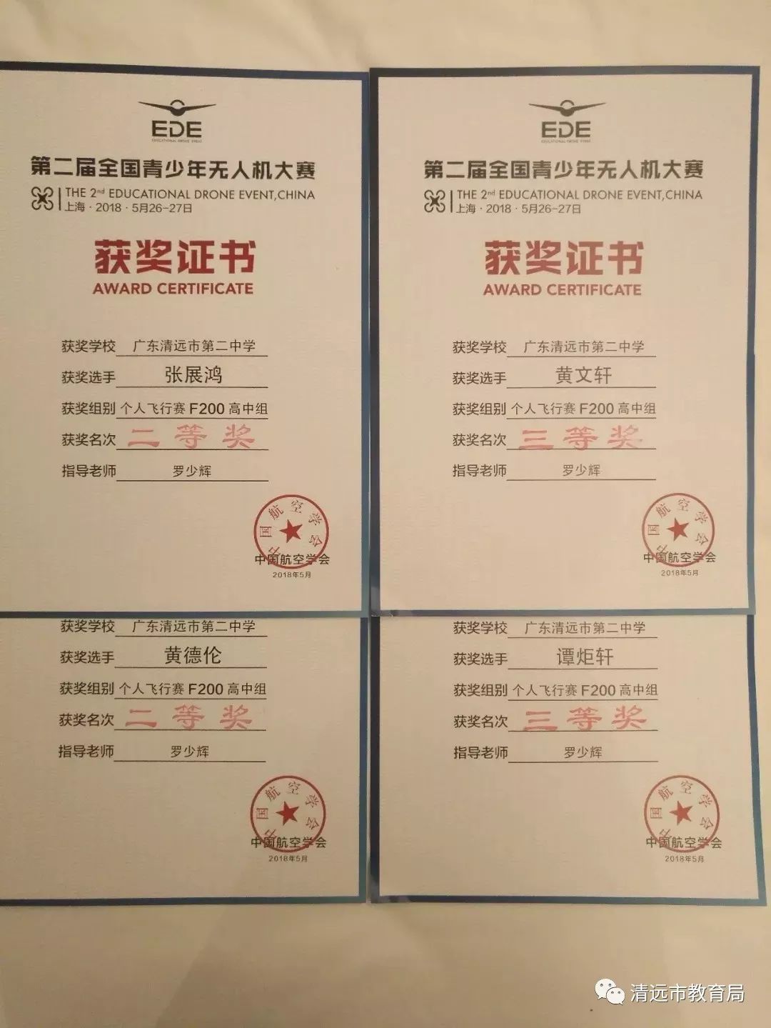 2018年5月26日至27日,清远市第二中学罗少辉老师带领学生张展鸿、黄德伦、黄文轩、谭炬轩组成的无人机团队参加了由中国航空学会主办,在上海大学举行的第二届全国青少年无人机大赛。